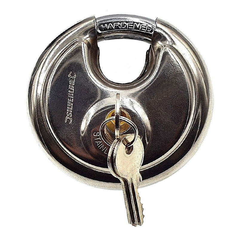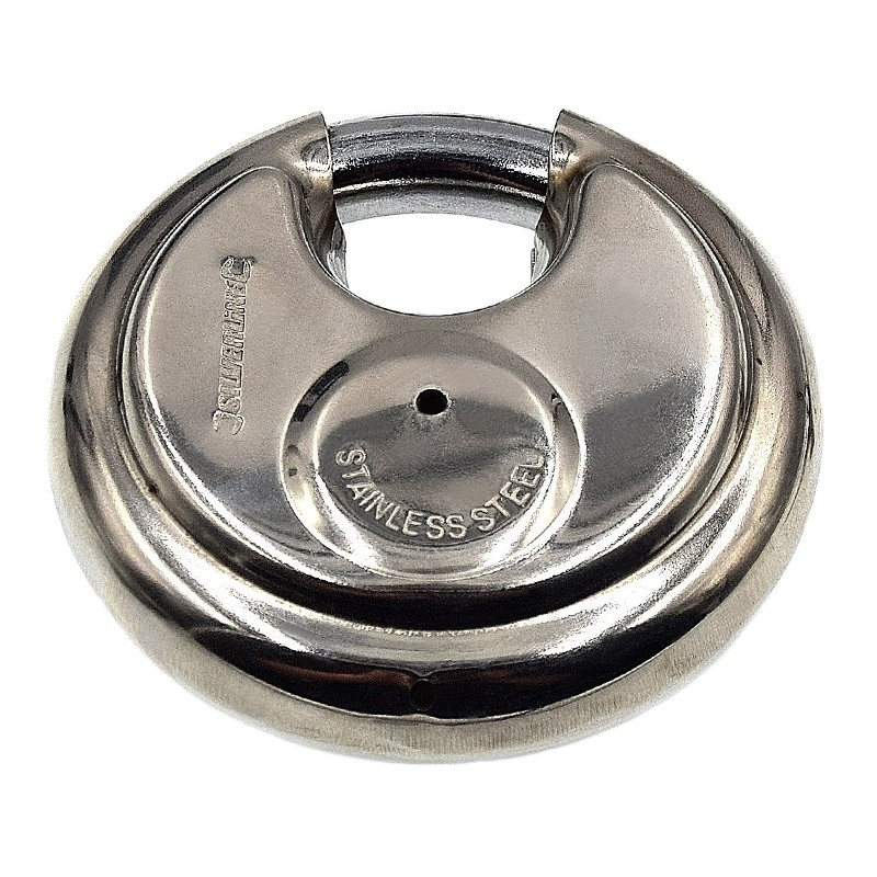 Cadenas de forme circulaire très robuste en acier inoxydable avec résistance maximale à la corrosion. Anse rotative en acier durci et à double verrouillage garantissant davantage de résistance aux attaques, y compris au sciage et à la découpe.